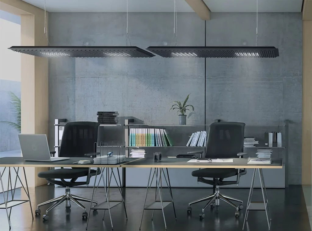 Dans les open spaces, les solutions combinant éclairage de bureau et traitement acoustique apportent une réponse double : confort visuel et réduction des nuisances sonores.