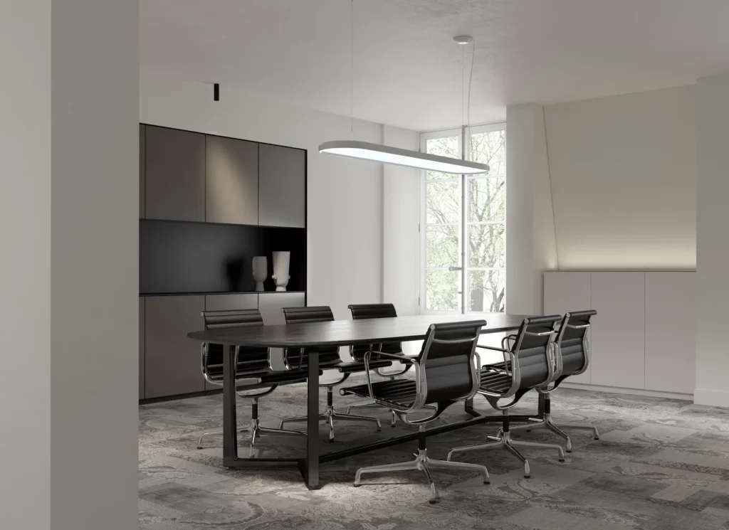 Dans les salles de conférence, nous recommandons de combiner éclairage direct et indirect pour garantir le confort visuel et la qualité des échanges.